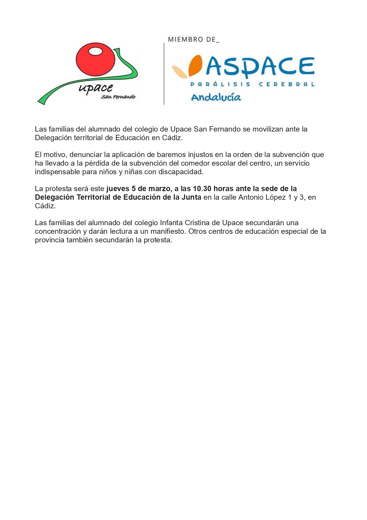 Las familias del alumnado del colegio de Upace San Fernando se movilizan ante laDelegación territorial de Educación en Cádiz. marzo 4, 2026 admin Upace